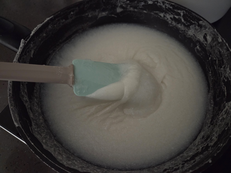 찹쌀 2큰 술에 물 한 컵 넣고 저어가며 찹쌀풀을 끓인 뒤 식혀 둡니다.
