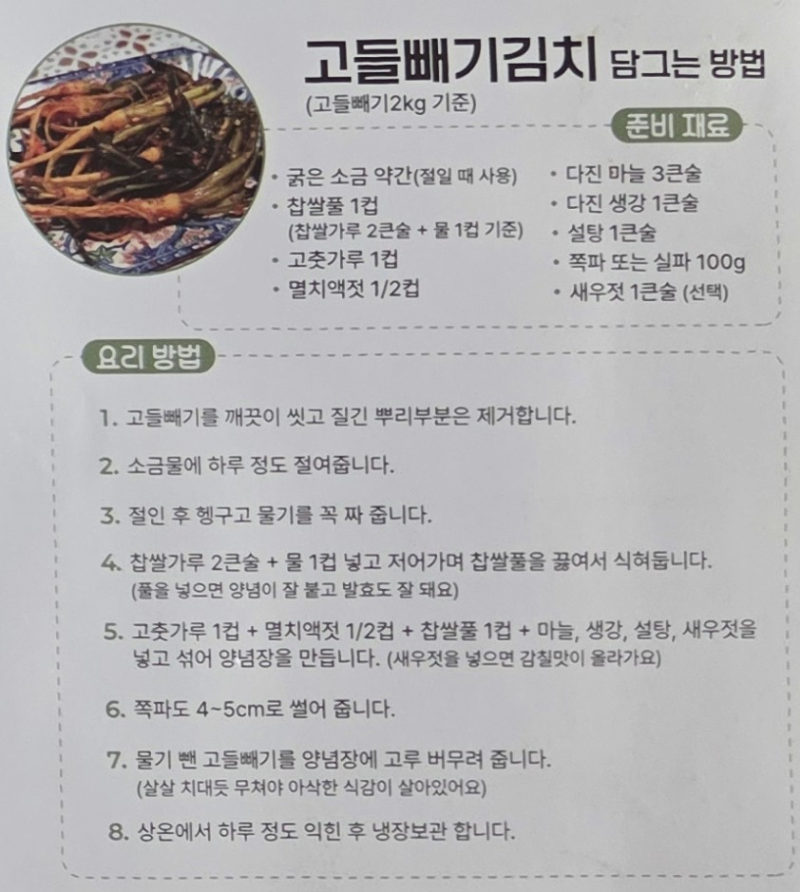 고들빼기 김치 담그는 법, 쓴 물 빼는 법, 그리고 효능 등등 자세히 써 있는 안내서와 다음번 구매를 위한 정보도 있었습니다.