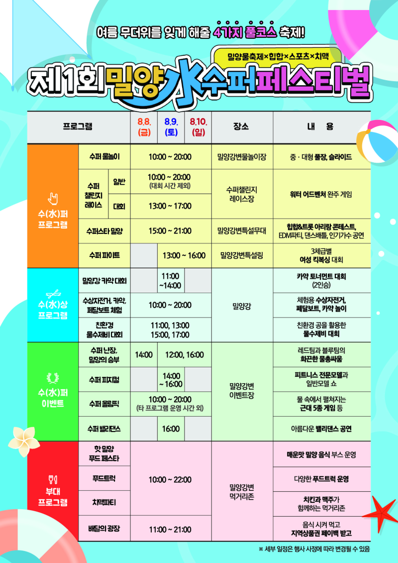 水수퍼 프로그램: 수퍼 물놀이, 수퍼 챌린지 레이스, 수퍼스타 밀양(힙합&트롯 아리랑 콘테스트), 수퍼파이트(킥복싱)