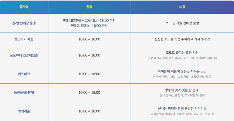 개장식 포도판매장 농·특산물판매장 포도밟기 포도따기 포도건강체험관 포도키즈파크 외식업지부먹거리존 푸드트럭존