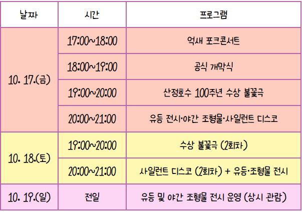 올해 축제는 산정호수 축조 100주년을 기념해 대규모 야간 프로그램이 새롭게 운영된다. 축제의 하이라이트는 10월 17일과 18일 저녁 산정호수 위에서 펼쳐지는 대형 수상불꽃극으로, 불꽃쇼와 함께 호수의 역사와 이야기가 결합된다. 수상 오브제와 무용수 퍼포먼스, 불꽃 연출이 어우러져 호수와 예술이 하나 되는 장엄한 무대를 선사할 예정이다.