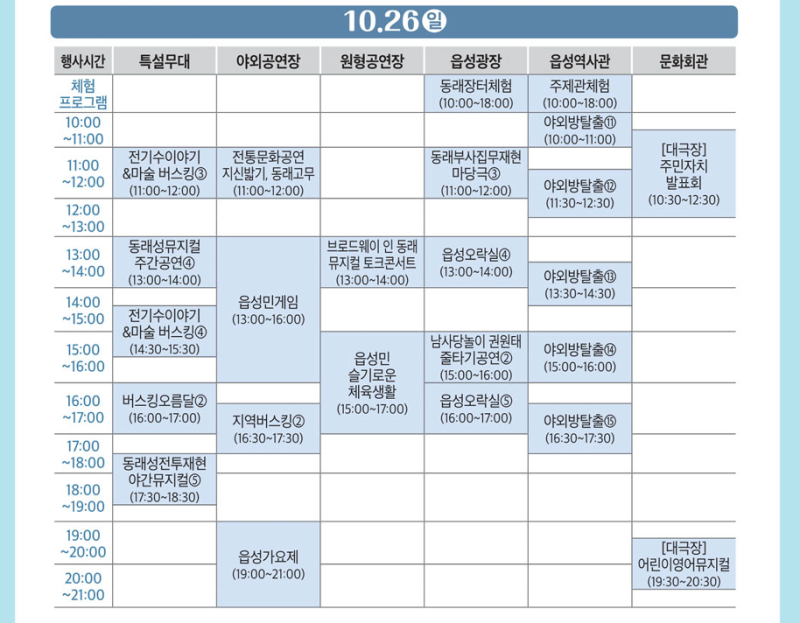 개막공연, 동래읍성가요제, 전통줄타기, 슬기로운 읍성민 체육생활, 버스킹공연, 동래부사집무재현 마당극, 전기수 이야기 버스킹, 마술버스킹, 민속예술공연, 읍성민 솜씨자랑, 기획공연‘뮤지컬 갈라쇼’, 생활문화예술제, 오페라 ‘동래로 온 춘향이’, 발달장애아동 작품전시회, 어린이영어뮤지컬, 한복패션쇼, 북문미디어아트, 축제학술콘서트 등 18종