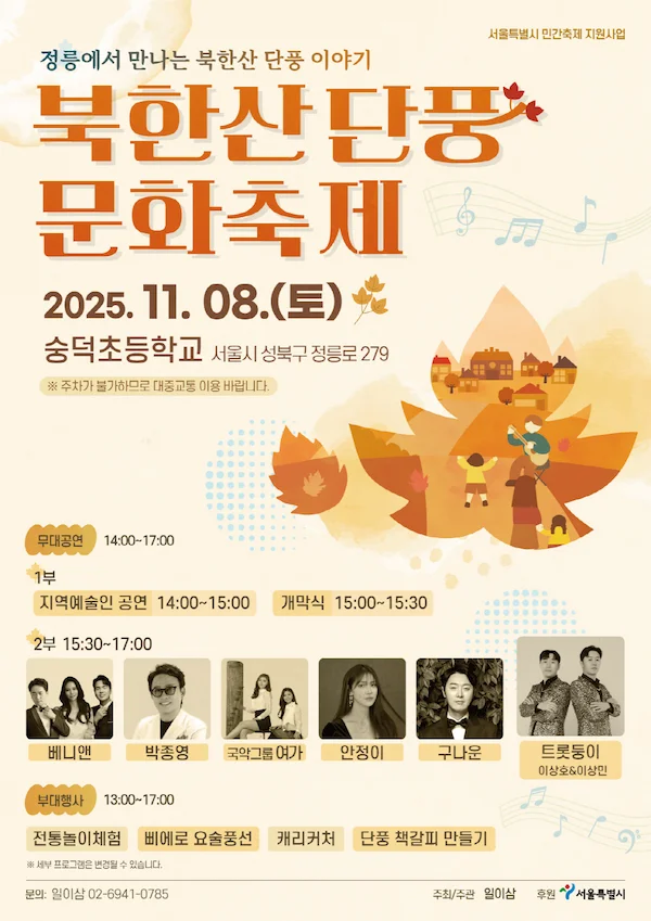 이번 축제는 북한산 단풍철을 맞아, 도심 속에서도 가을의 정취를 느낄 수 있도록 기획된 시민참여형 문화행사로, 주민과 시민이 함께 즐길 수 있는 공간으로 마련되었다.