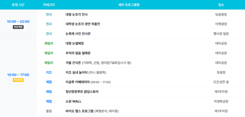 ○ 주요프로그램: 대형 눈조각 전시(야간 전시), 대학생 눈조각 경연대회, 시민눈조각 경연대회, 태백산 눈꽃등반대회, 이글루 카페 운영, 키즈존·패밀리존 운영, 대형눈썰매장, 건강체험관 운영 등
