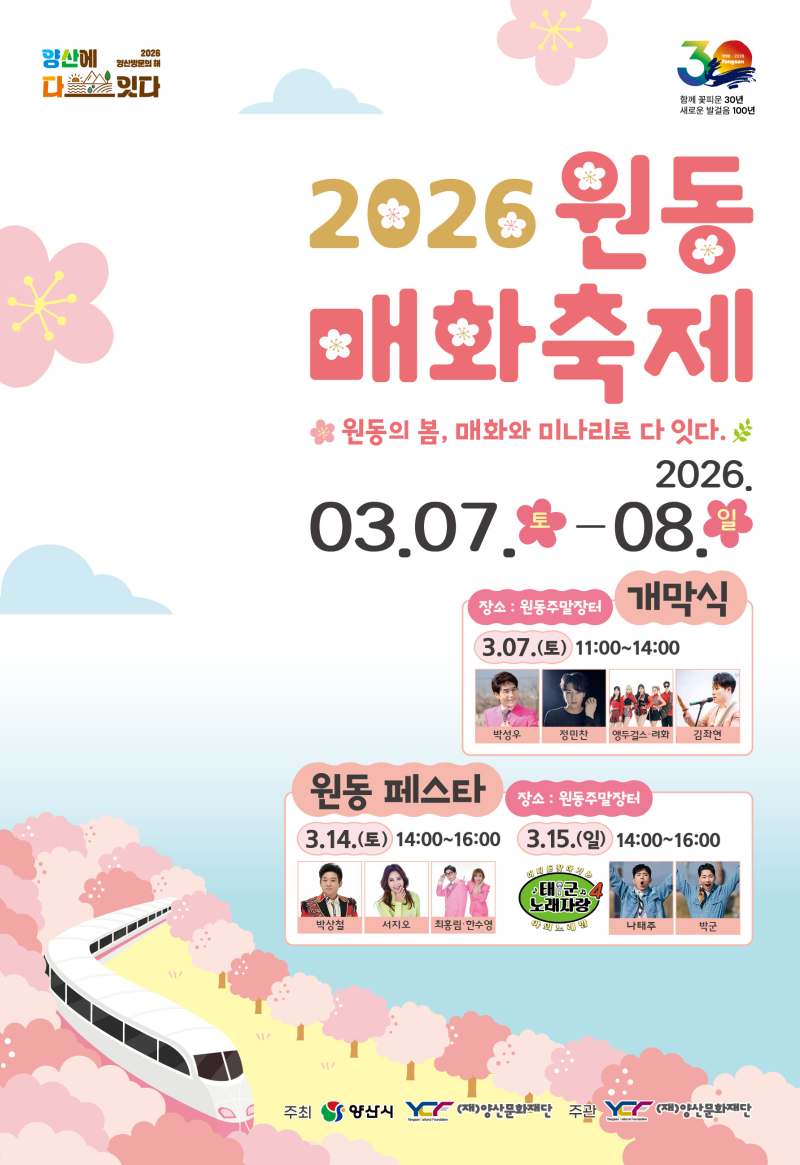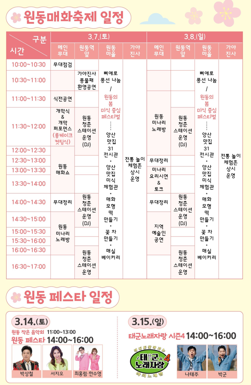 3월 7일(토)~8일(일) 원동매화축제.. 3월14일(토)~15일(일) 계획된 축제를 1주일 당긴 것임. 단지 공연 프로그램은 당기지 못하고 그대로 원동페스타 일정으로 소화함.