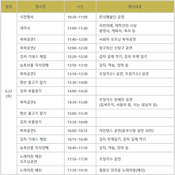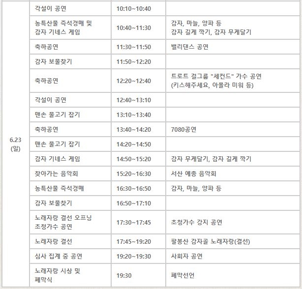 주 관 : 팔봉산 감자축제추진위원회(위원장 이정식)