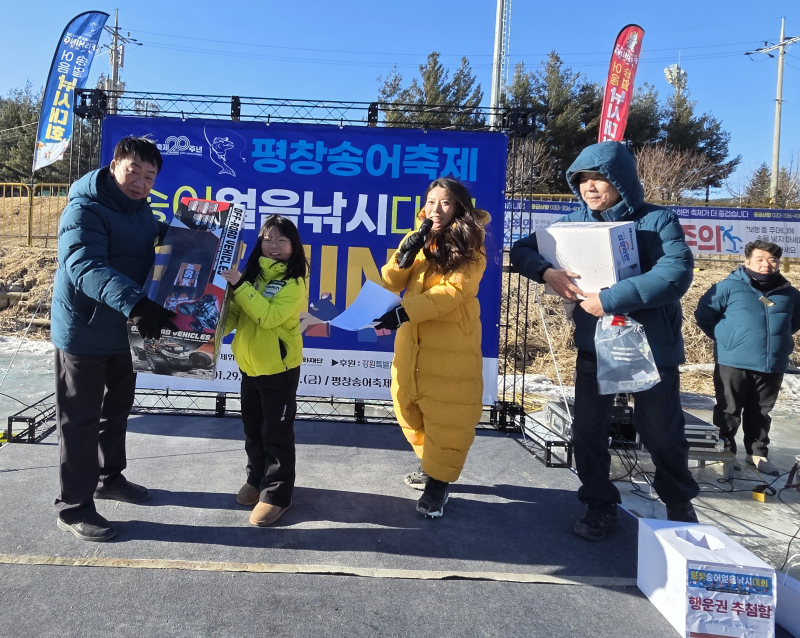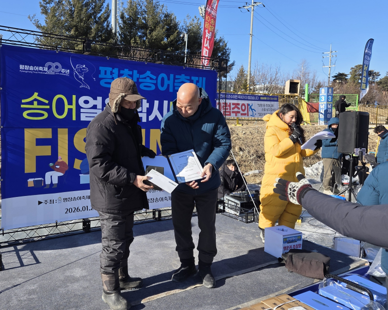 강원도 대표 겨울축제인 평창송어축제 20주년을 맞아 ‘2026 평창송어 얼음낚시 대회’가 1월 29일과 30일 양일간 열렸다. 첫날 대회 결과 1위는 1325그램의 큰 송어를 잡아 올린 강인성씨가 수상했다.