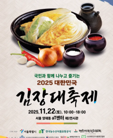 한국농수산식품유통공사(aT, 사장 홍문표)는 22일 서울 aT센터 제2전시장에서 서울시ㆍ(사)대한민국김치협회와 공동주관으로 국민과 함께 나누고 즐기는 “2025 대한민국 김장대축제”를 개최한다.
